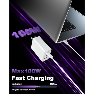 USB C Charger Block 100W, 3-Port GaN Super Fast Charger, Type C 65W Wall Charger Adapter with 10ft USB C Charging Cable for MacBook Pro/Air